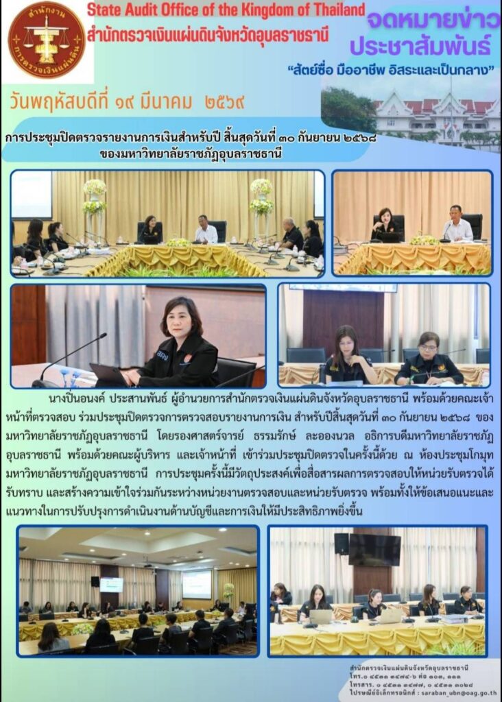 การประชุมปิดตรวจรายงานการเงินสำหรับปี สิ้นสุดวันที่ 30 กันยายน 2568 ของมหาวิทยาลัยราชภัฏอุบลราชธานีกิจกรรมตรวจสอบ, ข่าวที่น่าสนใจ, ข่าวประชาสัมพันธ์, ภาพกิจกรรมมีนาคม 19, 2026มีนาคม 19, 2026 Post Views: 63