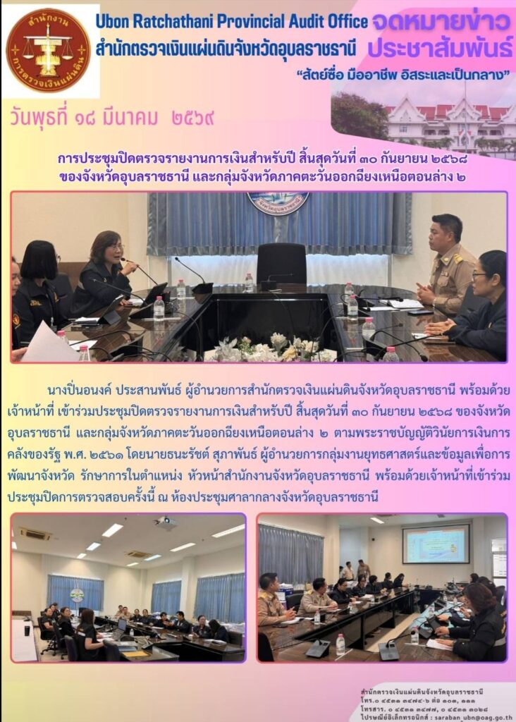 การประชุมปิดตรวจรายงานการเงินสำหรับปี สิ้นสุดวันที่ 30 กันยายน 2568 ของจังหวัดอุบลราชธานี และกลุ่มจังหวัดภาคตะวันออกเฉียงเหนือตอนล่าง 2กิจกรรมตรวจสอบ, ข่าวที่น่าสนใจ, ข่าวประชาสัมพันธ์, ภาพกิจกรรมมีนาคม 19, 2026 Post Views: 53