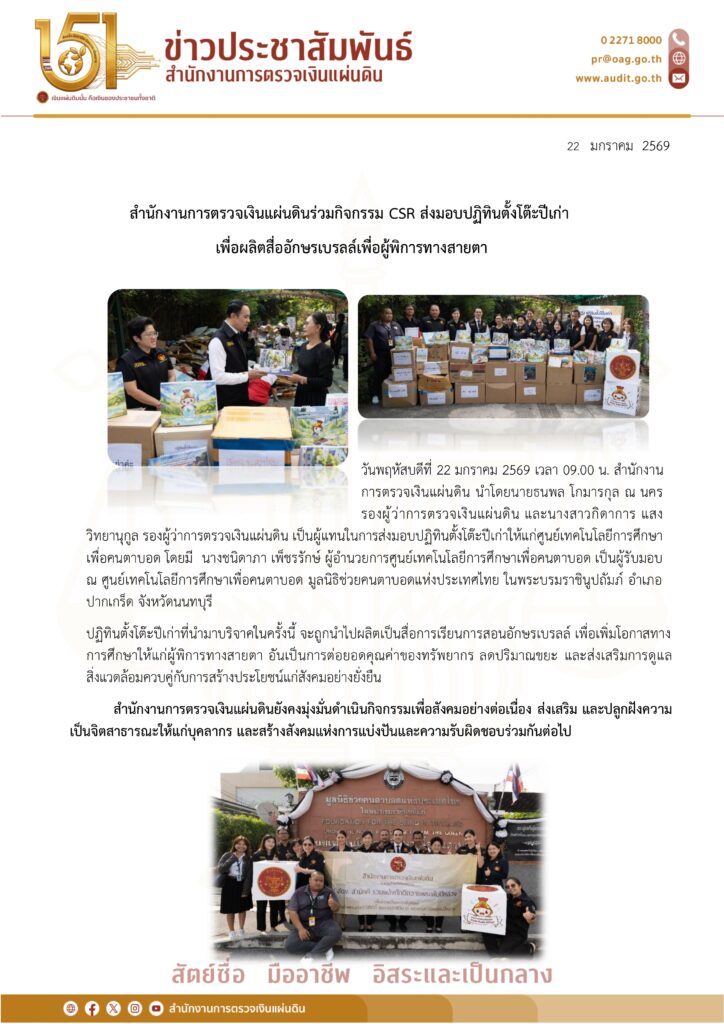 สำนักงานการตรวจเงินแผ่นดินร่วมกิจกรรม CSR ส่งมอบปฏิทินตั้งโต๊ะปีเก่าเพื่อผลิตสื่ออักษรเบรลล์เพื่อผู้พิการทางสายตากิจกรรมเพื่อสังคม, ข่าวที่น่าสนใจ, ข่าวประชาสัมพันธ์, ภาพกิจกรรมมกราคม 23, 2026มกราคม 23, 2026 Post Views: 63